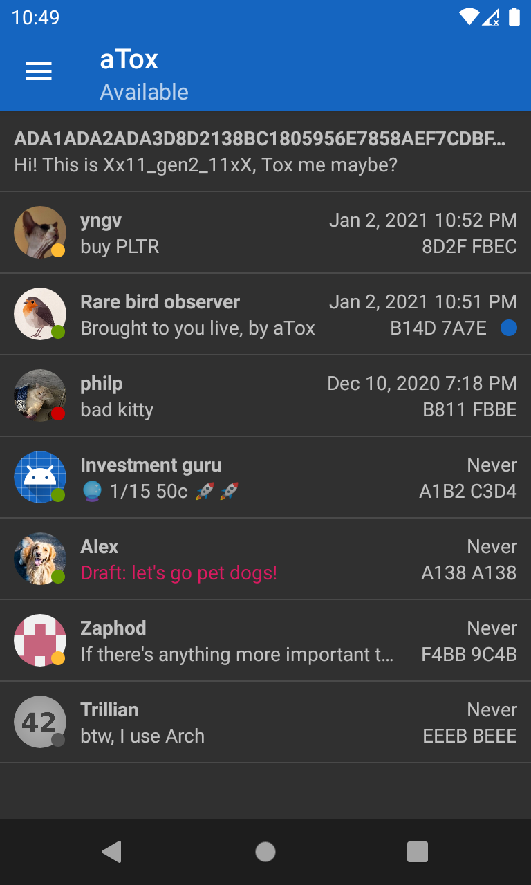 Tox has no central servers that can be raided, shut down, or forced to turn over data — the network is made up of its users. Say goodbye to server outages!